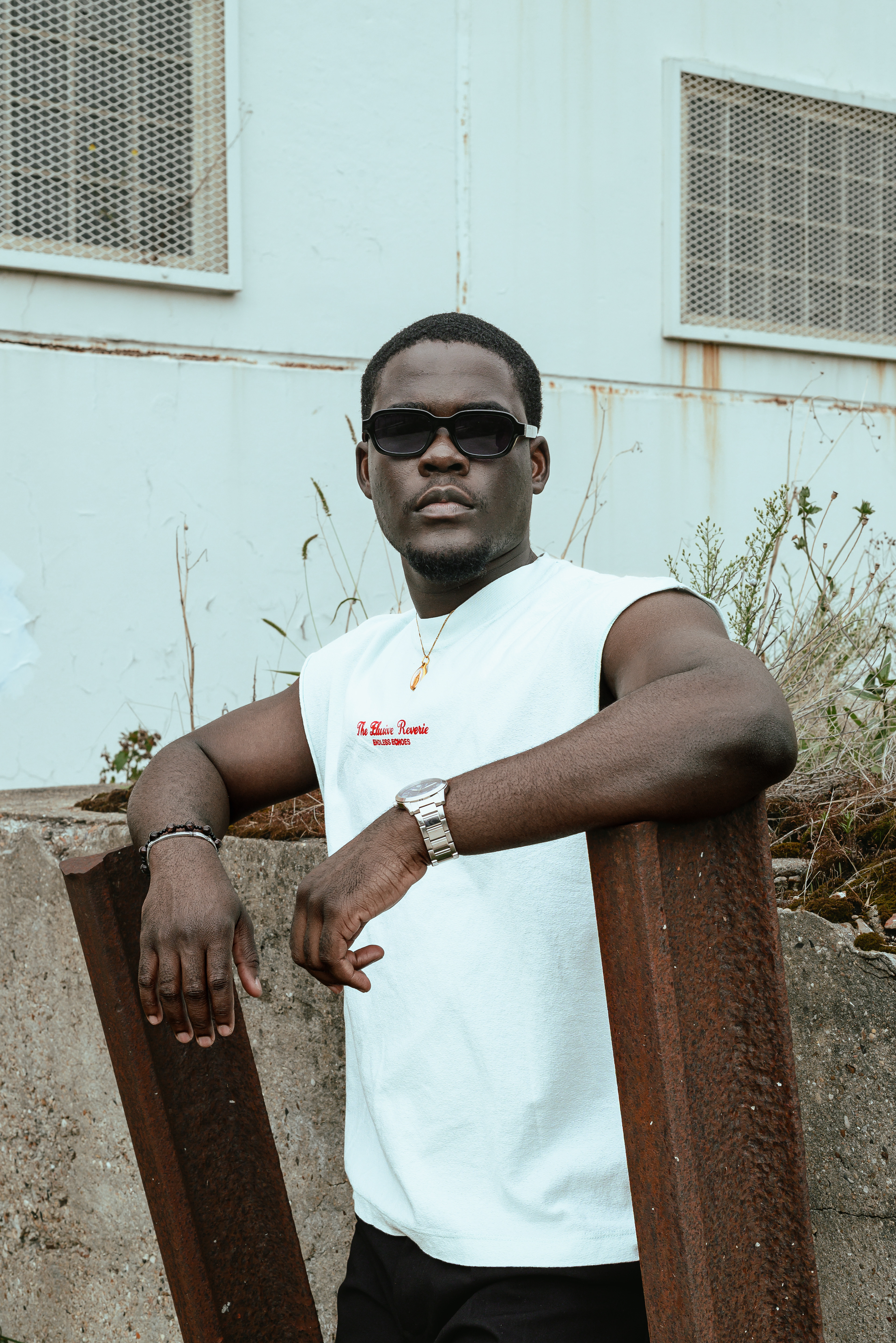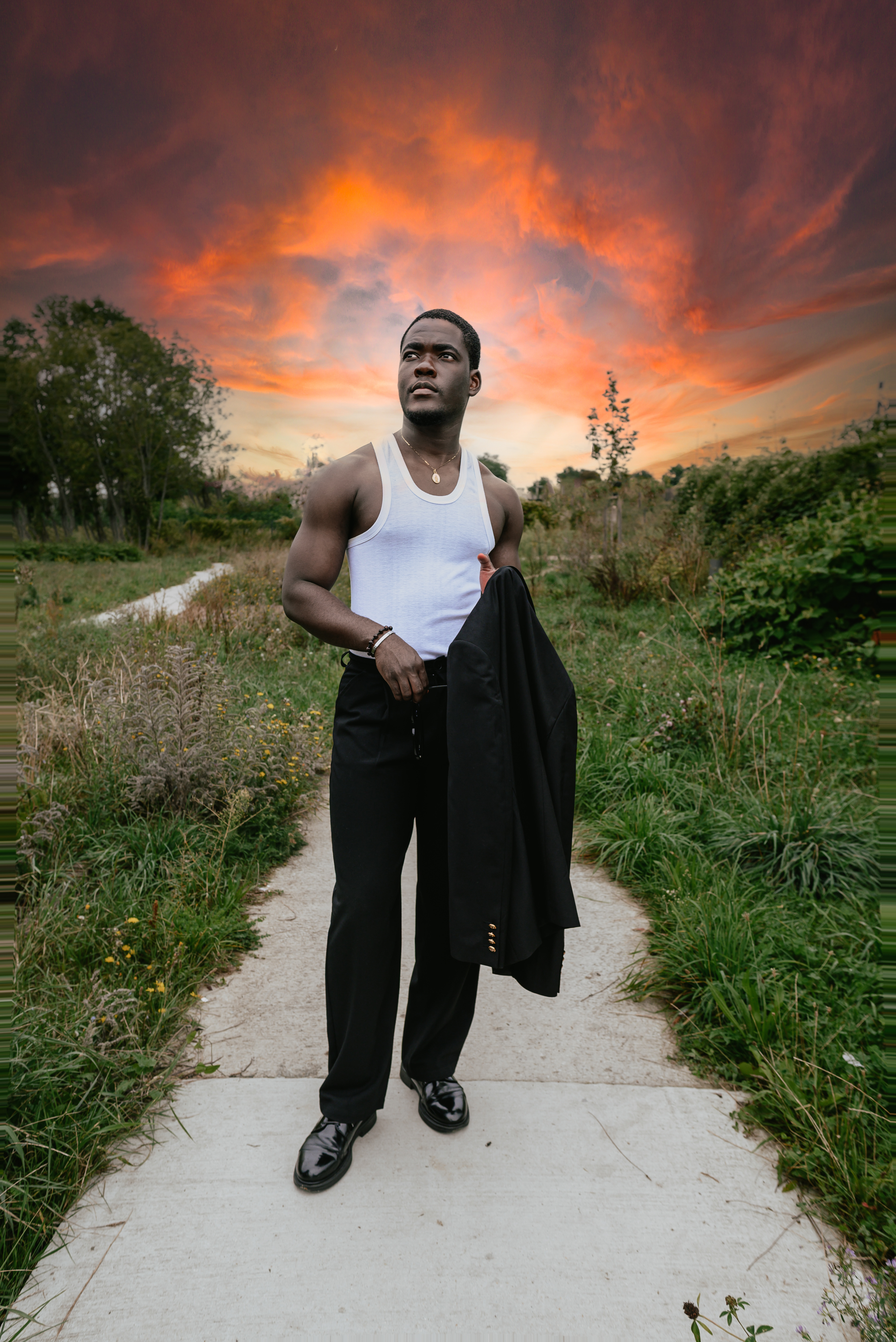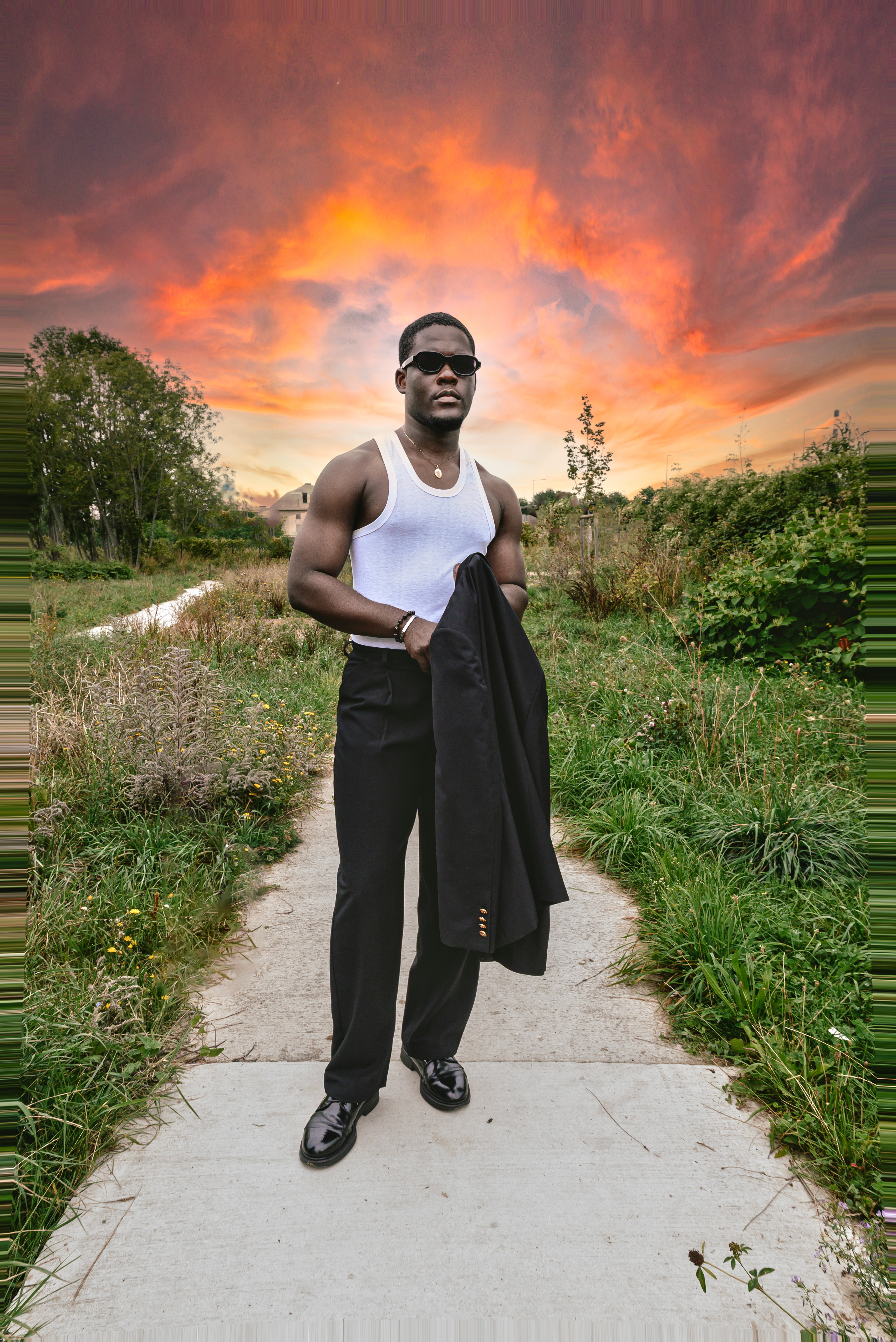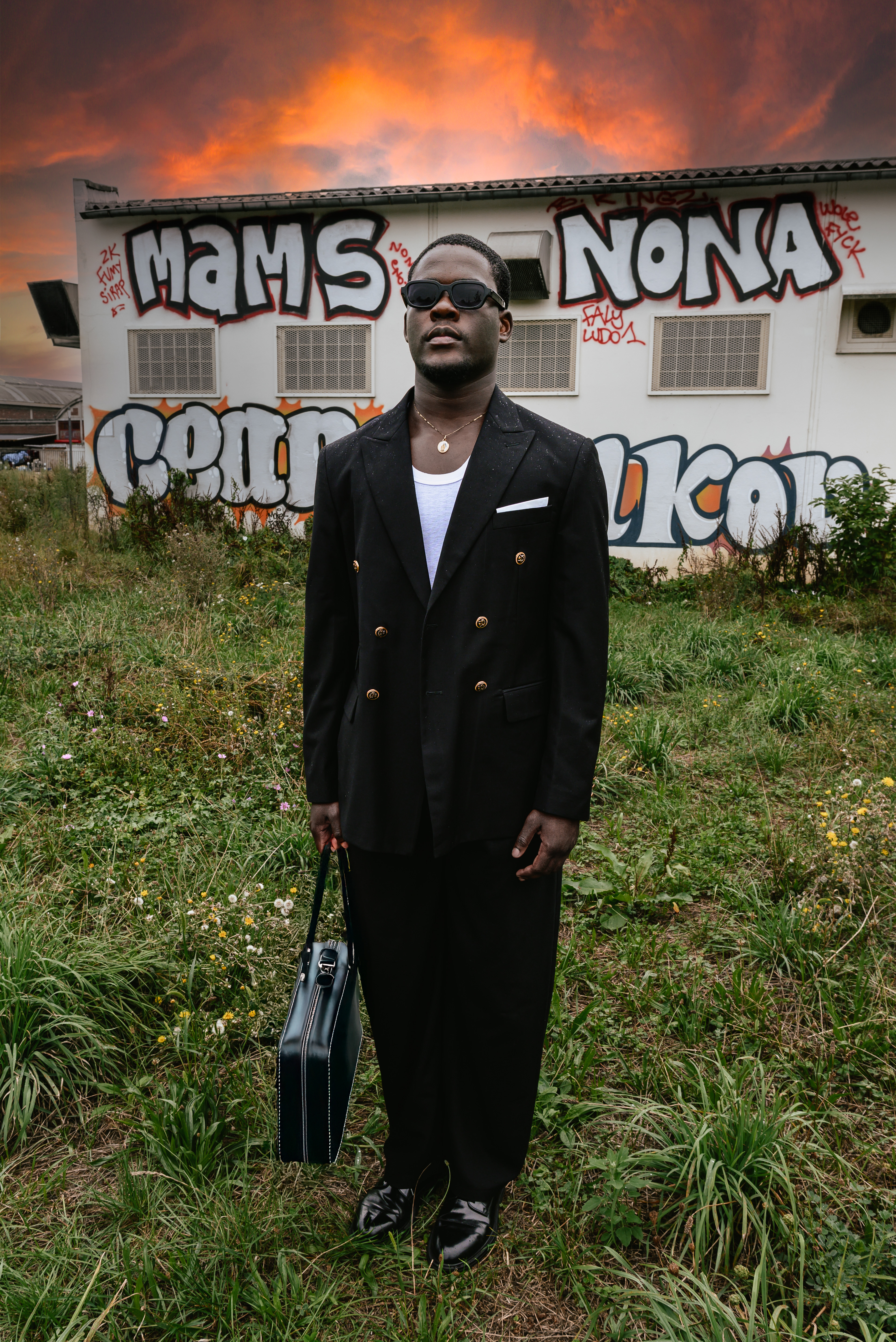 Pour la première partie du shooting, je me suis laissée porter par le contraste. Le lieu, la tenue, le charisme du modèle… tout m’a naturellement ramenée à une vibe “Men in Black”, mais revisitée.